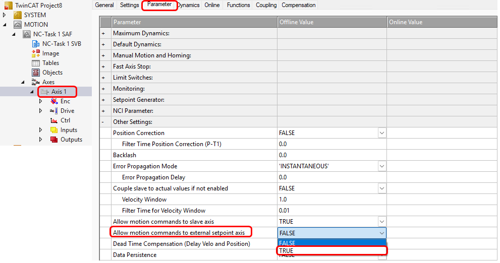 Axis>Parameter>Allow motion commands to external setpoint axis